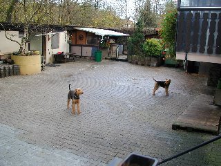 Beide Gebäude werden durch einen großen Innenhof verbunden, so daß sich die Hunde sowohl im Hause als auch im Freien bewegen können.